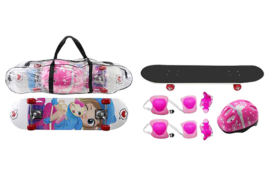 Nosso skate infantil vem acompanhado de um Kit de Proteção completo (capacete, protetores para as mãos, joelheiras, cotoveleiras) e suporta até 40kg, sendo ideal para o público iniciante.
